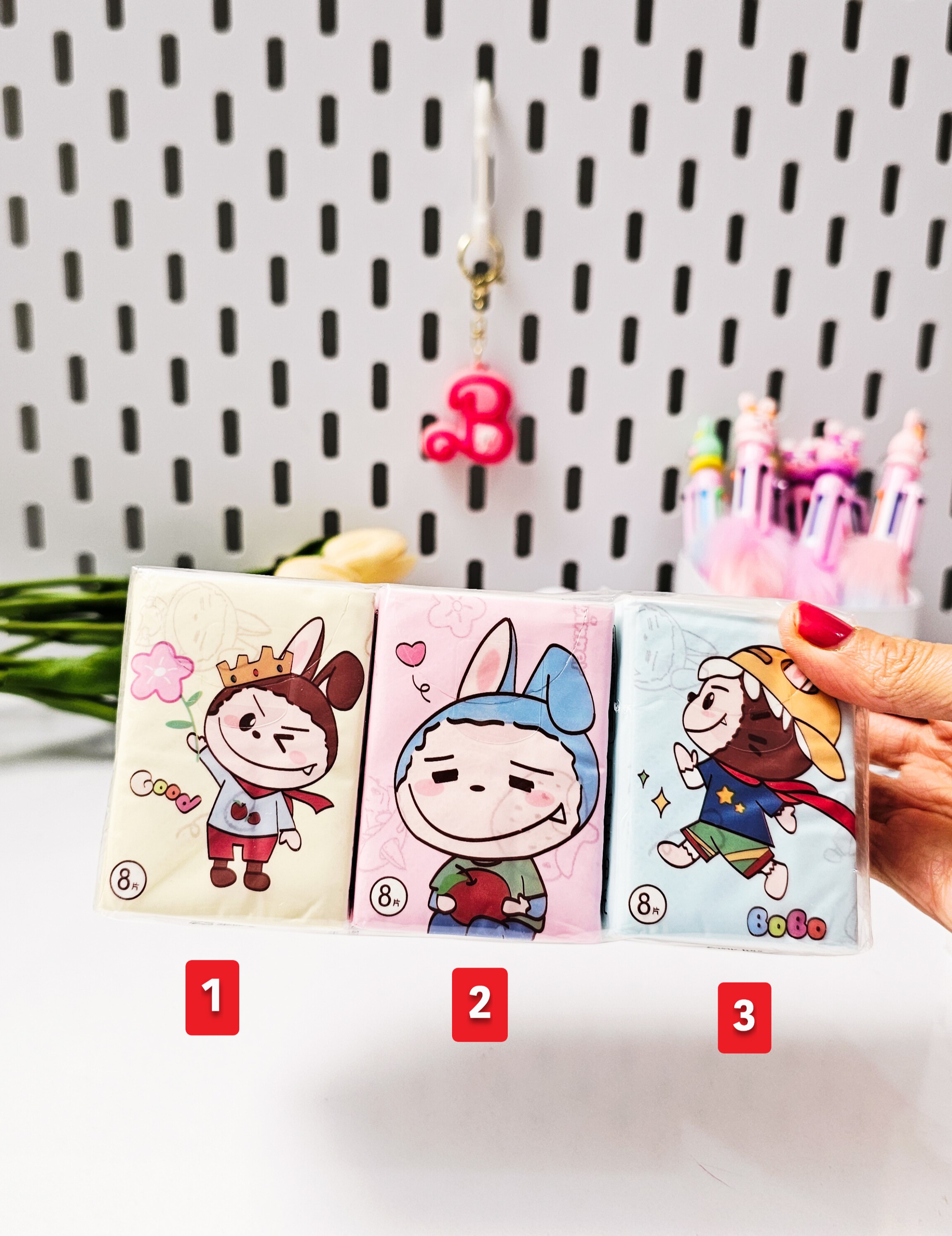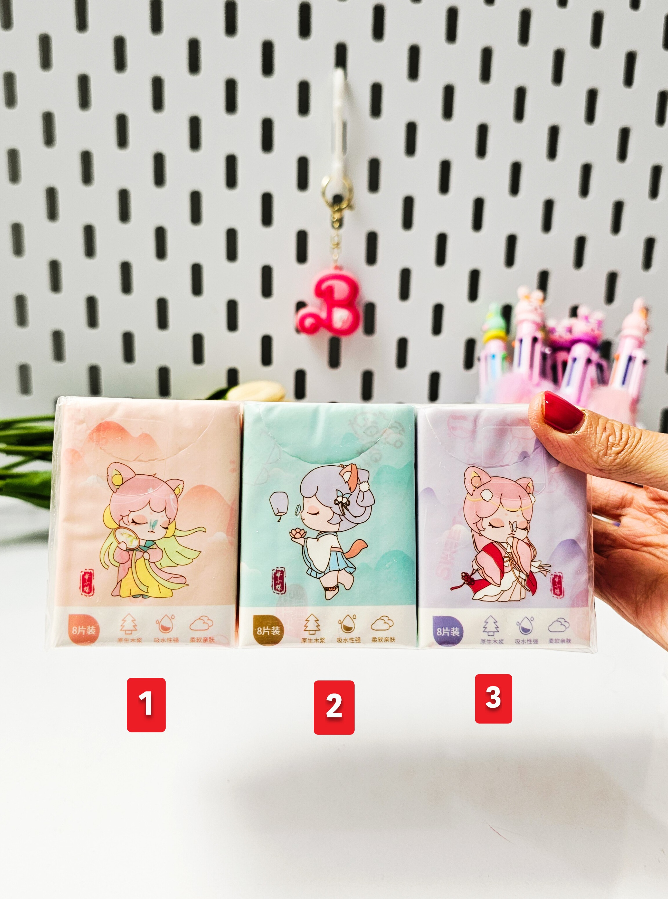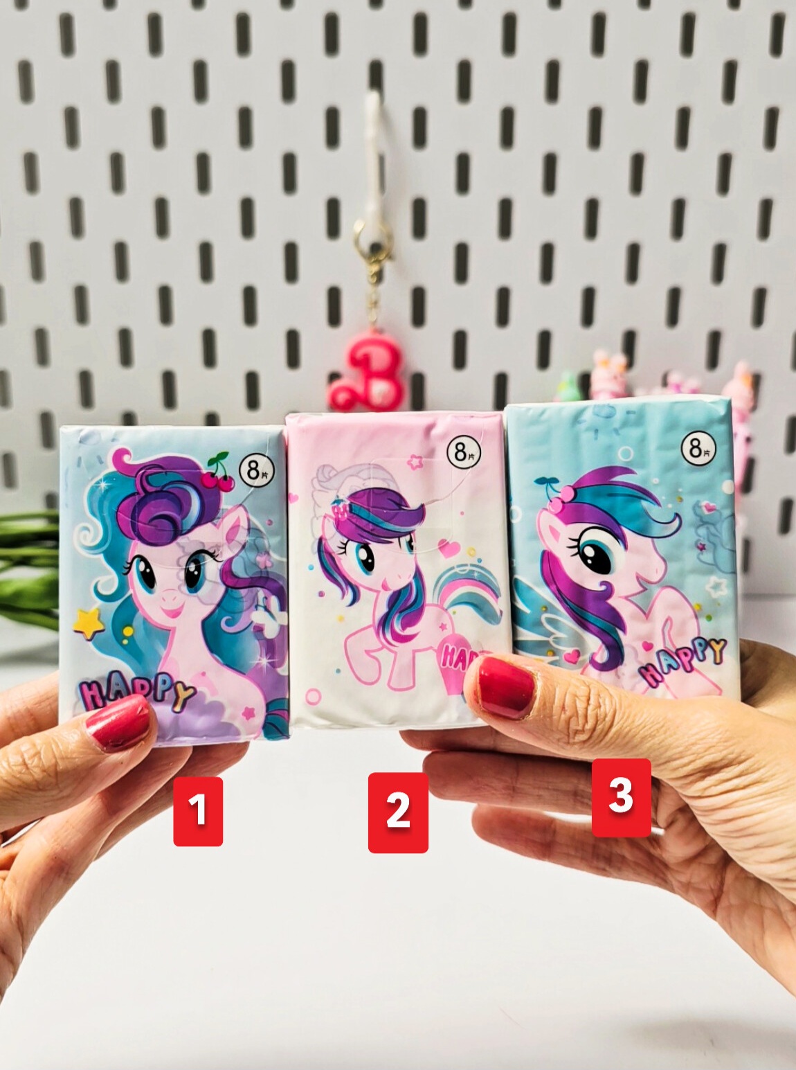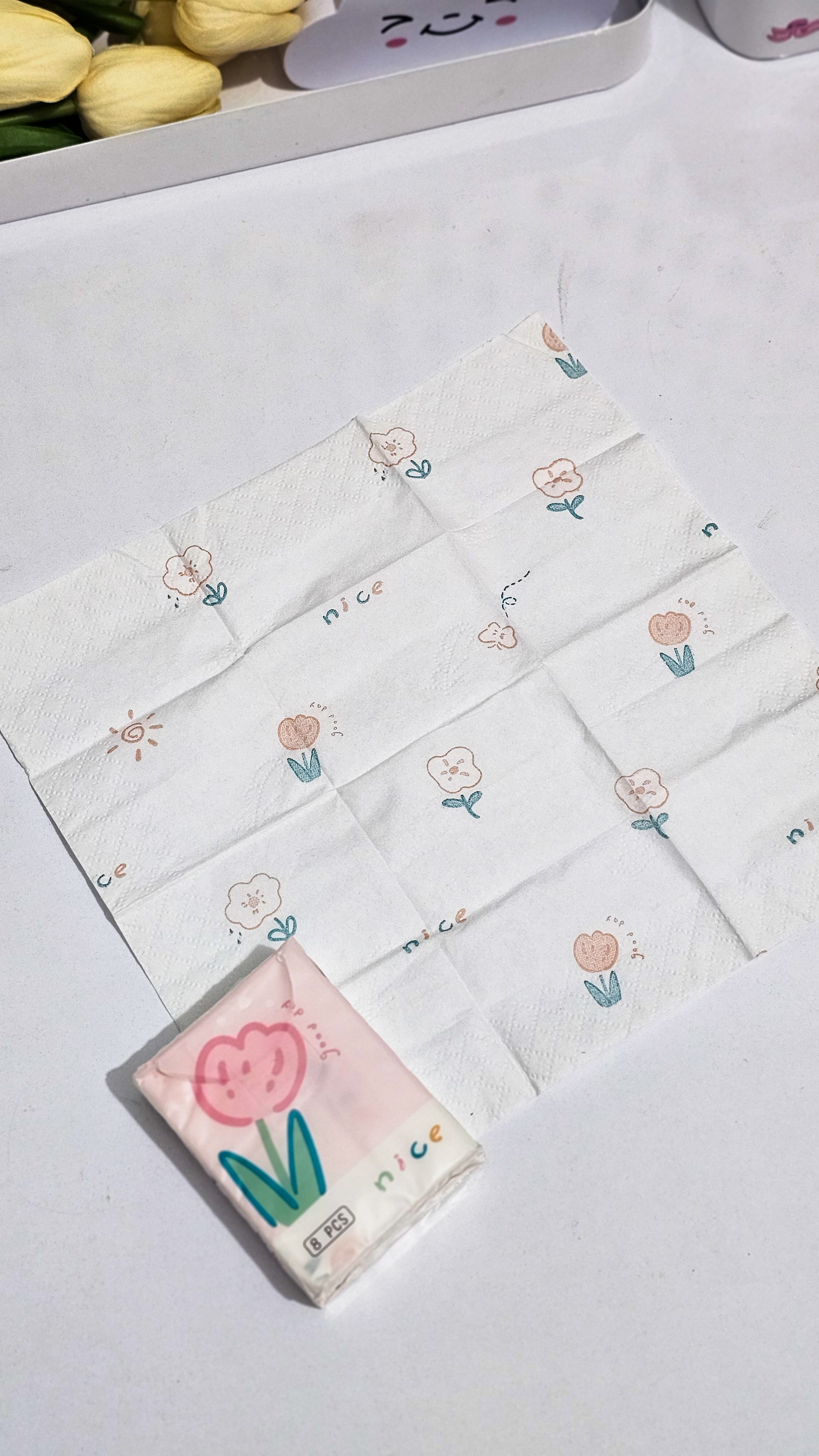 توی هر بسته: ۸ عدد دستمال طرحدار باکیفیت هست که طرح هاشون شبیه جلدشون مثلا گل برگه هاشم گلدار یا یونیکورن برگه هاش یونیکورن و ...